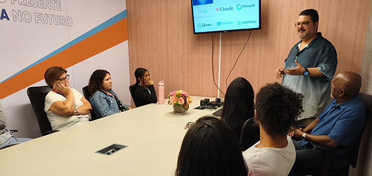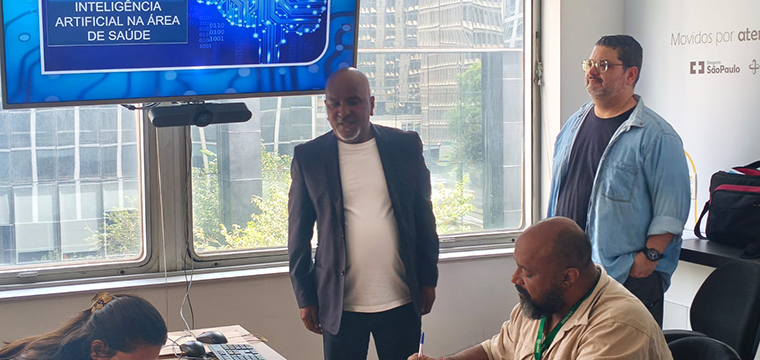 Representando o SINTETEL, os dirigentes sindicais Ricardo Martins, Gilson Carvalho e Luís Faustino falaram sobre a importância do evento para a categoria. Na ocasião, Ricardo Martins ministrou a palestra sobre Saúde e Inteligência Artificial no Trabalho para os trabalhadores da Almaviva, nos sites Santo Amaro e Rua Bela Cintra.