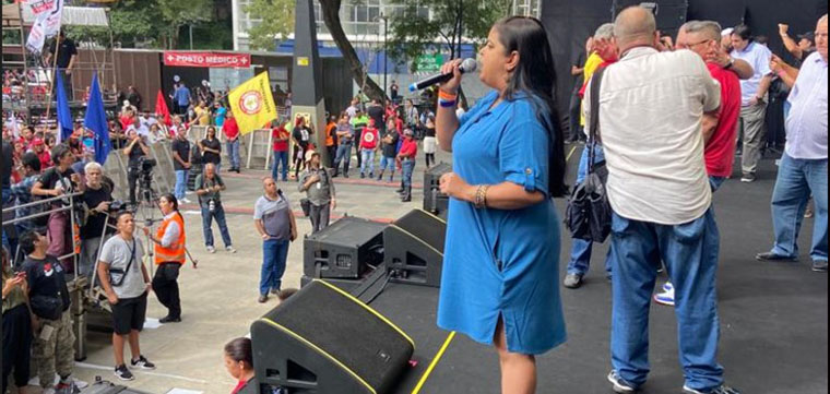 Diretora do SINTETEL, Maria Edna, fala representando as mulheres do setor de Telecom