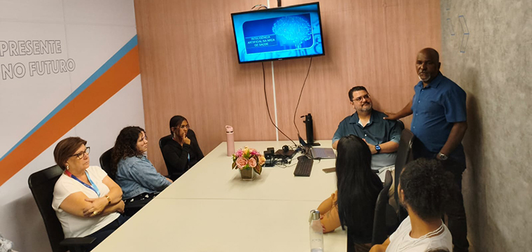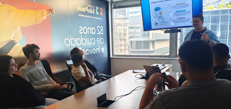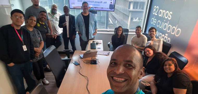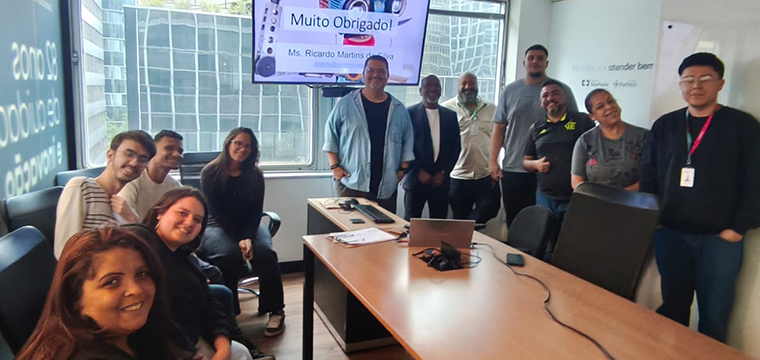 Representando o SINTETEL, os dirigentes sindicais Ricardo Martins, Gilson Carvalho e Luís Faustino falaram sobre a importância do evento para a categoria. Na ocasião, Ricardo Martins ministrou a palestra sobre Saúde e Inteligência Artificial no Trabalho para os trabalhadores da Almaviva, nos sites Santo Amaro e Rua Bela Cintra.