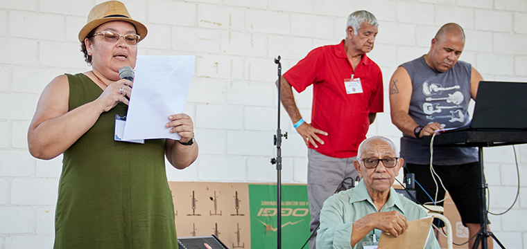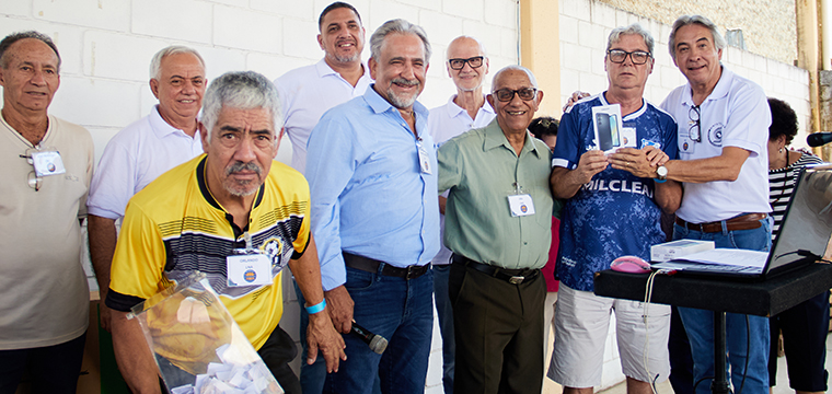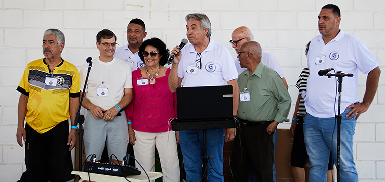 Gilberto Dourado, presidente do SINTETEL, cumprimenta o público presente
