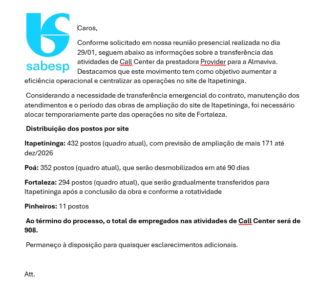 E a solução foi encontrada com a nova disposição do quadro de trabalhadores, como descrito abaixo no documento enviado pela Sabesp ao SINTETEL.
