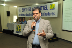 Na foto abaixo, Lauro Benedito Siqueira, presidente do Sinttel-MT, questiona o diretor da Telefônica.
