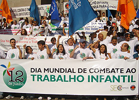 * Na manhã da última quinta-feira, dia 12 de junho, 15 sindicatos filiados à Força Sindical reuniram-se numa passeata de luta pelas crianças vítimas do trabalho infantil. O protesto, realizado no centro da cidade de São Paulo, começou na Praça da República, encerrando-se na Catedral da Sé, com a celebração de uma missa. O companheiro Fábio Oliveira da Silva, do Departamento de Juventude do Sintetel, participou do evento e concluiu que "a união dos jovens trabalhadores se faz cada vez mais necessária". Ainda acrescentou que o objetivo da marcha foi chamar a atenção da população e do poder público para que todos colaborem com a erradicação da exploração infantil. * Escrita por Luciana Marillac.