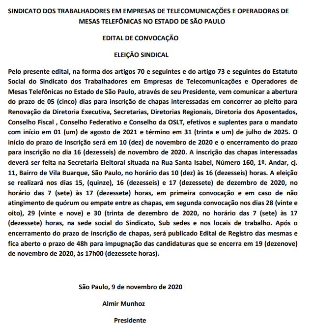 SINTETEL convoca eleição sindical para a renovação da diretoria da entidade,