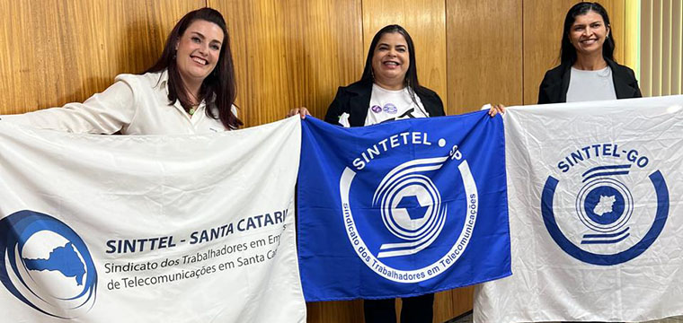 Ana Katia Garces (Sinttel-GO), Francyelle Malte e Gisele Benthien (Sinttel-SC) e Maria Edna Medeiros (SINTETEL, FENATTEL e UGT)