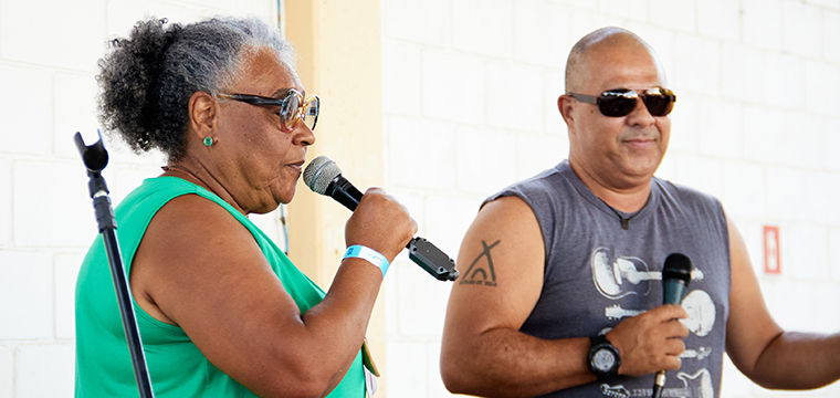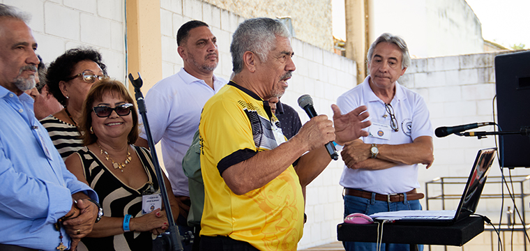 Gilberto Dourado, presidente do SINTETEL, cumprimenta o público presente