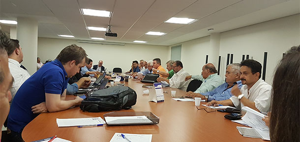 Bancada dos trabalhadores (a direita) discute proposta com os patrões