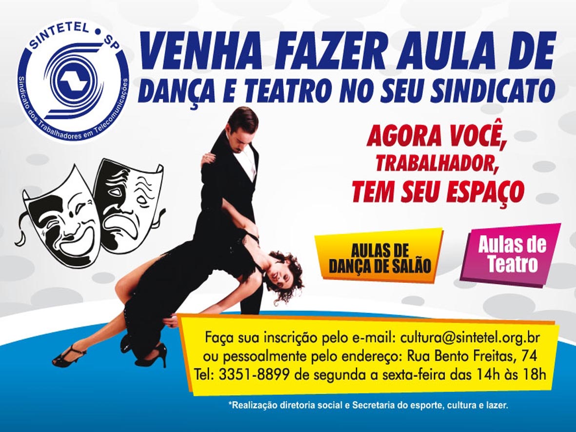 O Sintetel criou um espaço de cultura e lazer para os trabalhadores em telecomunicações. As atividades culturais terão início no dia 16 de novembro com aulas de teatro e dança de salão. Os cursos serão ministrados na Rua Bento Freitas, 74 (Espaço Cultural do Sintetel ao lado da Sede do Sindicato).
