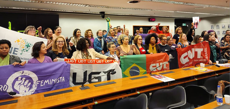 Cristiane do Nascimento (1ª à direita), do SINTETEL; e a companheira Marcia Adão, do SIEMACO, participam da audiência pública pela ratificação da C190