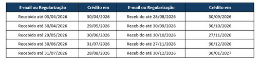 O crédito acontecerá conforme tabela abaixo: