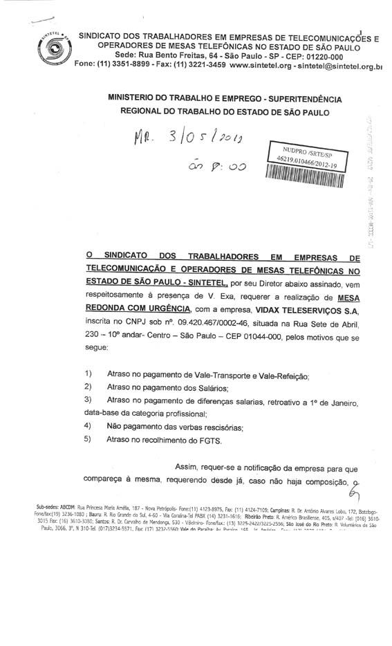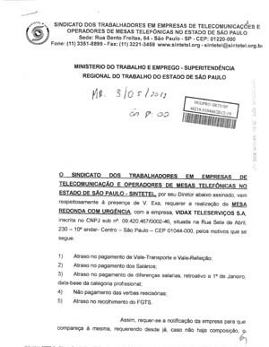 O Sintetel protocolou na Superintendência Regional de Trabalho o pedido de convocação da Vidax para esclarecer os atrasos nos salários dos teleoperadores. Mesmo após o Sintetel coordenar as paralisações de diversos sites por falta de pagamento, a Vidax nada fez para solucionar o problema.