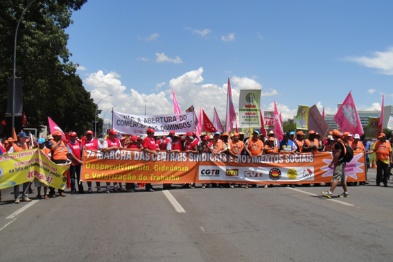 Os manifestantes caminharam do Estádio Mané Garrincha até a Praça dos Três Poderes para pressionar o governo e o Congresso Nacional a apoiar a pauta trabalhista.