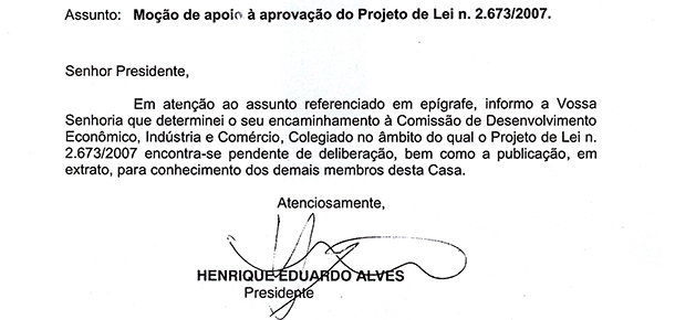 No texto da Moção de Apoio, o deputado informa que determinou o encaminhamento do Projeto à Comissão de Desenvolvimento Econômico, Indústria e Comércio, onde o texto aguarda análise, e tornou público aos parlamentares o apoio dele à aprovação do Projeto.