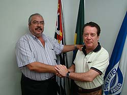 Velho conhecido do nosso Sindicato, Manuel fez questão de fazer uma visita antes de regressar a Lisboa. Na foto, Manuel Silva cumprimenta Almir Munhoz, presidente do Sintetel.